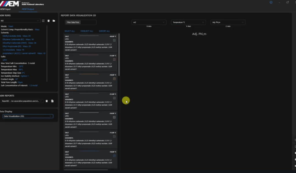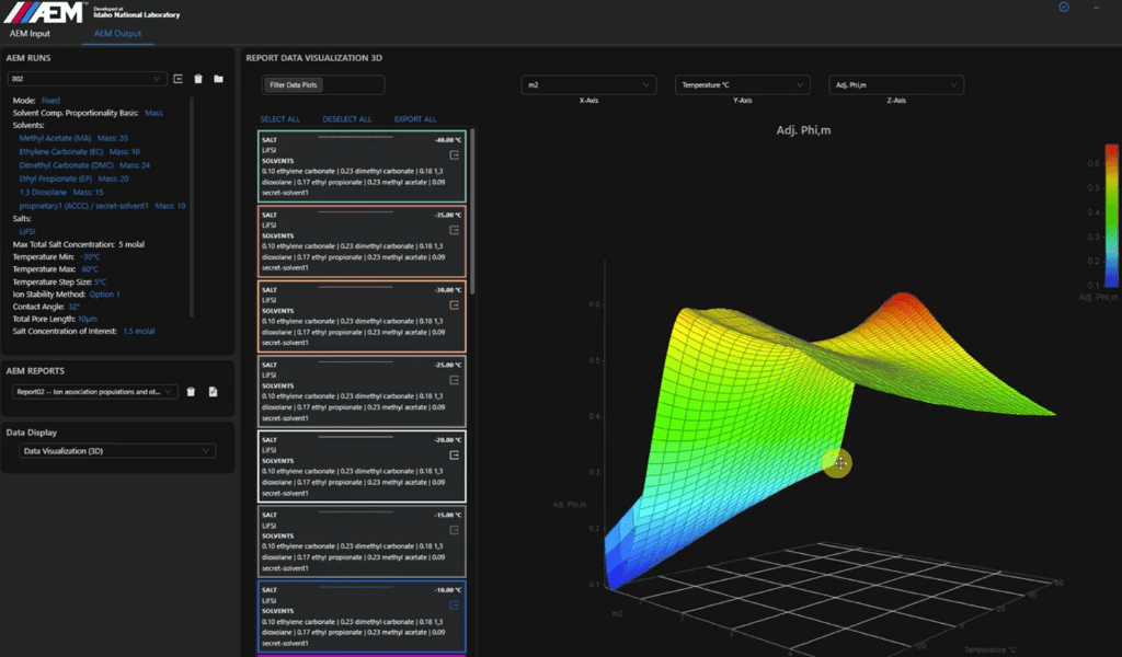 The Advanced Electrolyte Model (AEM) developed by Dr. Kevin Gering at Idaho National Laboratory (INL) and exclusively available through Ridgetop Group, is an innovative molecular simulation tool that revolutionizes electrolyte chemistry optimization. With over 100 property metrics generated in each run, it effectively acts as a virtual laboratory for exploring genome-level electrolyte properties. AEM’s extensive database encompasses more than 50 solvents and 30 salts, offering users a wealth of options while considering the consequences of their selections. Its scientific foundation is grounded in the Nonprimitive, Nonrestricted Associated form of the Mean Spherical Approximation (NPNRAMSA), further enhanced by an ion-solvation equation of state (IS-EOS) for precision in predictions. Predictions for many systems have average percent deviations with lab data that fall within 5-10%, with many conditions below 5% deviation. The model has been validated with scores of electrolyte systems over hundreds of unique conditions. Yet, AEM is more than a scientific tool; it is a catalyst for global change. By enabling a shift away from fossil fuels, it accelerates the adoption of electric vehicles and the deployment of grid-scale battery systems. In essence, AEM not only advances battery research but also propels us toward a cleaner and more sustainable energy future, making energy storage more efficient and cost-effective on a global scale. AEM is the engine driving the clean energy revolution, empowering the global battery R&D community with an evolving set of tools that help to shape a brighter, greener future, one optimized electrolyte at a time. AEM is an innovative beacon, leading us toward a cleaner and more efficient energy future, revolutionizing how we power our world!