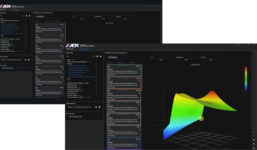The Advanced Electrolyte Model™ (AEM™) is a powerful simulation tool developed by Dr. Kevin Gering at Idaho National Laboratory (INL) and exclusively offered by Ridgetop Group. AEM functions as a virtual laboratory, allowing researchers to predict and analyze the behavior of battery electrolytes at the molecular level—producing over 100 key property metrics in a single simulation run.