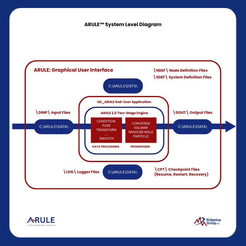 ARULE™ is a modular predictive analytics engine designed for real-time system health estimation. It uses adaptive Kalman filtering and dynamic stress modeling to deliver accurate Remaining Useful Life (RUL), State of Health (SoH), and Prognostic Horizon (PH) predictions—fully integrable into onboard, edge, or cloud-based systems across aerospace, defense, and industrial domains.