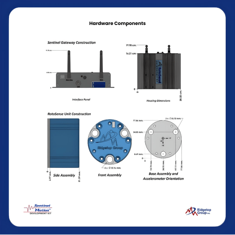 The Sentinel Motion Development Kit (SMDK)™ is a customizable pilot solution for evaluating system health monitoring in real-world environments. Designed for quick deployment, the kit includes everything needed to collect, process, and visualize condition-based data—from rugged RotoSense™ sensors to the intuitive MotionView™ software interface. Perfect for pilot studies, research, and early-stage implementation.